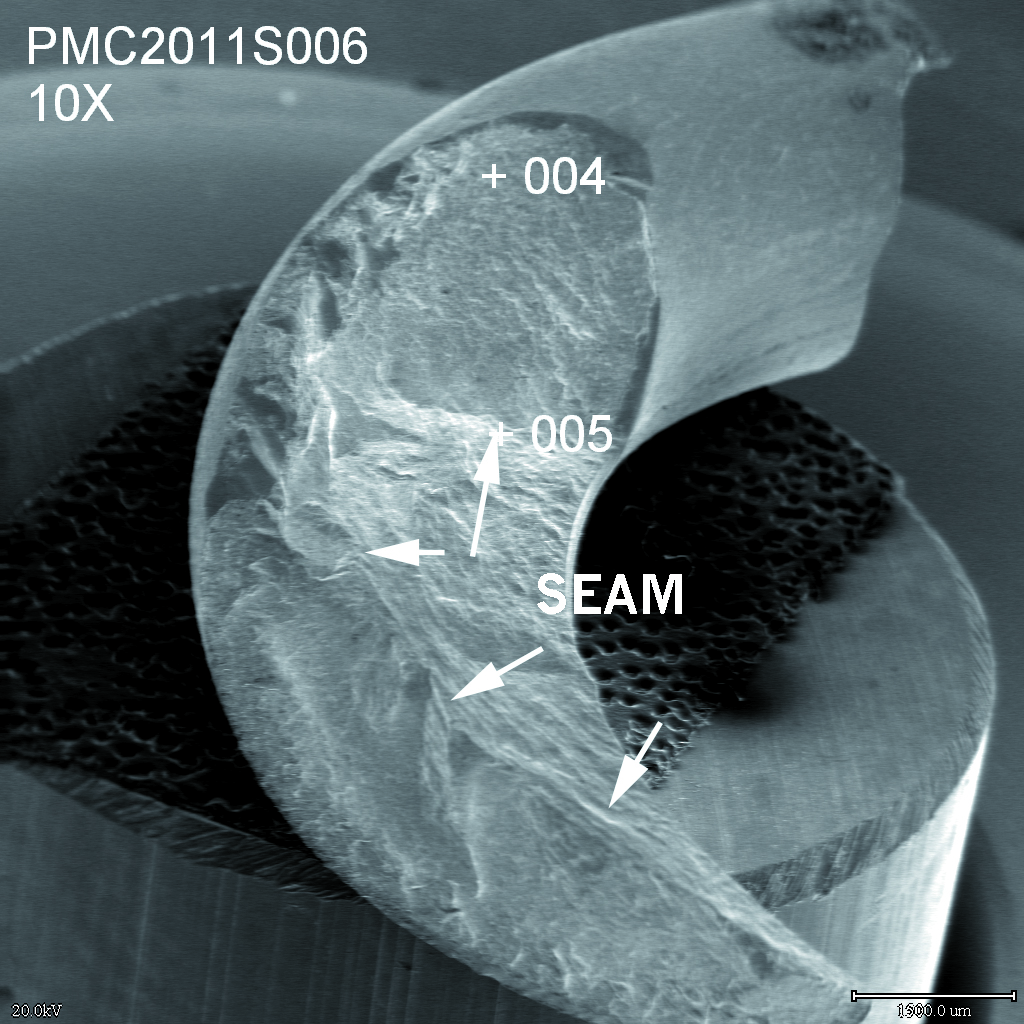 Close-up of main cap bolt that failed as result of decarburization during heat treat by supplier.